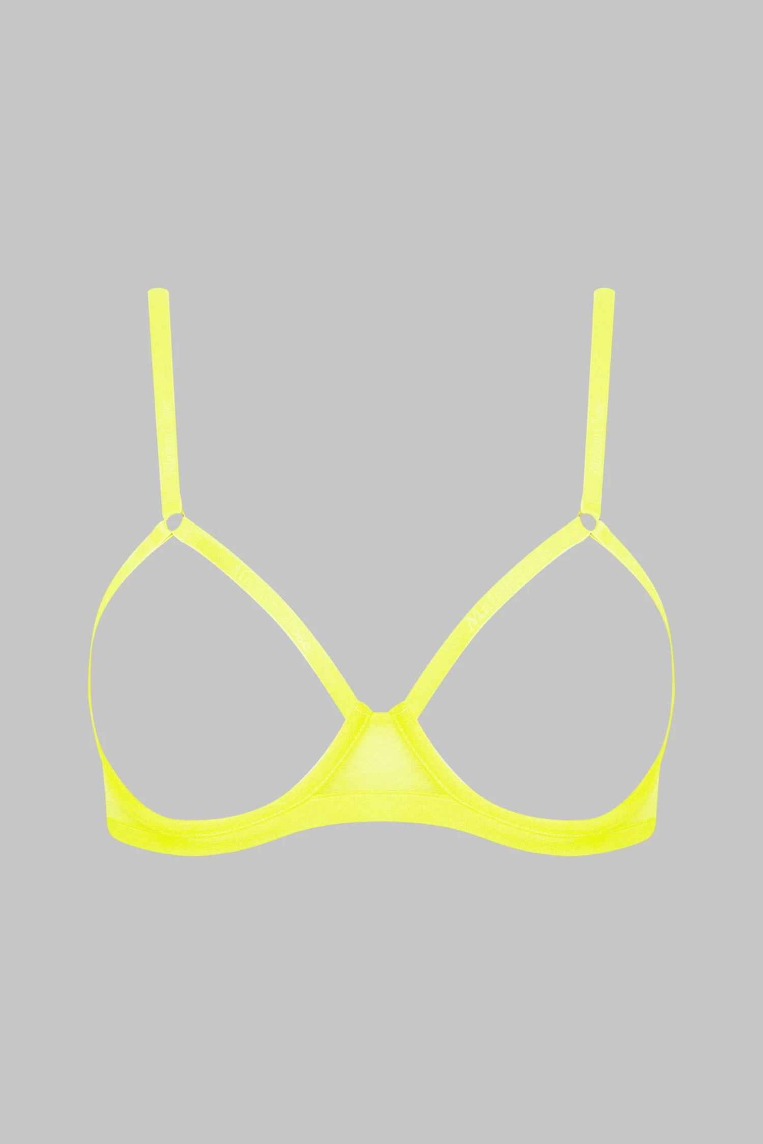 Le soutien-gorge ouvert avec armatures en tulle néon est la pièce irrévérencieuse de la collection.